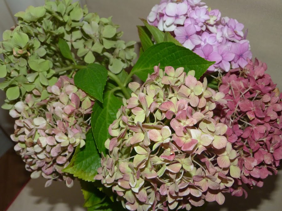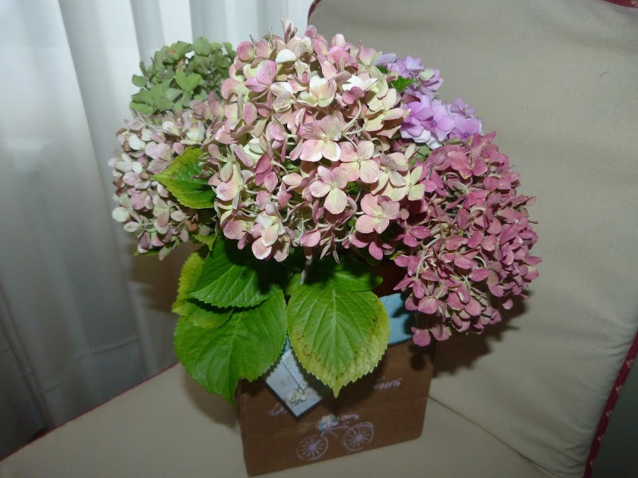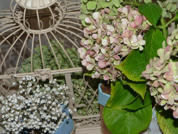 Cuando ya lo tenía terminado, mi madre me trajo unas hortensias de su jardín. Ya sabéis que las flores secas de la hortensia se dejan durante el invierno para que protejan a la planta de las heladas, y después se cortan en la época de la poda. Éstas que me trajo son todas de la misma planta, y al secarse veréis qué de tonalidades tan distintas han tomado... no sé cómo me gustan más las hortensias, frescas o secas. De momento las he puesto en agua, porque las hojas aún están verdecitas y me da pena que se sequen también.