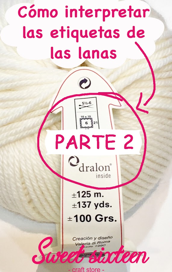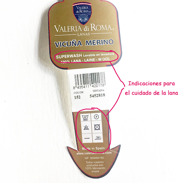 5.- Cuidado de la lana. Cuando tejemos a mano, siempre surge la misma pregunta... ¿Y para lavar este jersey?. Por suerte la etiqueta también nos ayuda con esto. Yo recomiendo lavar siempre a mano y dejar secar en posición horizontal sobre una toalla o algo así, pero cada vez hay más lanas Superwash. ¿Y qué es esto?, pues no es ni más ni menos que un tratamiento que se le da a la lana para que aguante los lavados en lavadora, eso sí, siempre en programa para lana o prendas delicadas. En la etiqueta que estoy usando de ejemplo lo ponen en la parte central. La verdad es que es una ayuda con el poco tiempo que tenemos hoy en día... También encontraréis siempre una zona en la etiqueta con los típicos símbolos de cuidados de cualquier prenda. Si admite plancha, lavadora, temperatura del agua, secadora, si hay que lavar en seco... Como son muchos los símbolos que se usan para el cuidado de prendas, estos los dejo para otro post, que dan para mucho!!