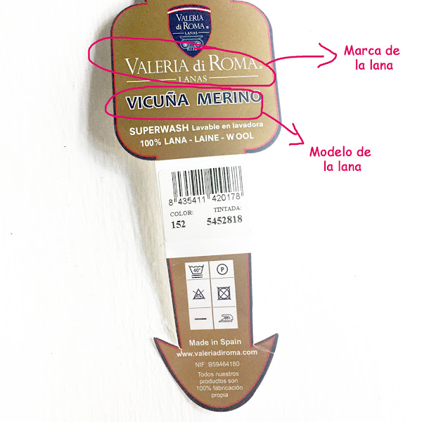 1.- La marca y el modelo de la lana pueden resultar datos muy obvios, pero por experiencia se que no todo el mundo lo tiende tan claro. No es raro encontrarme en la tienda con gente que necesita un ovillo de la lana Valeria di Roma, o Rosas Craft, u otras marcas, pero no saben decirte el nombre de la lana, que en realidad es el dato que necesito para saber qué lana necesitan. La marca es genérico, es decir, Valeria di Roma es una marca general, con muchas calidades distintas de distintas composiciones y grosores, pero Vicuña Merino es una lana concreta, y ese dato es el que tenemos que dar cuyando queremos comprar un ovillo determinado.