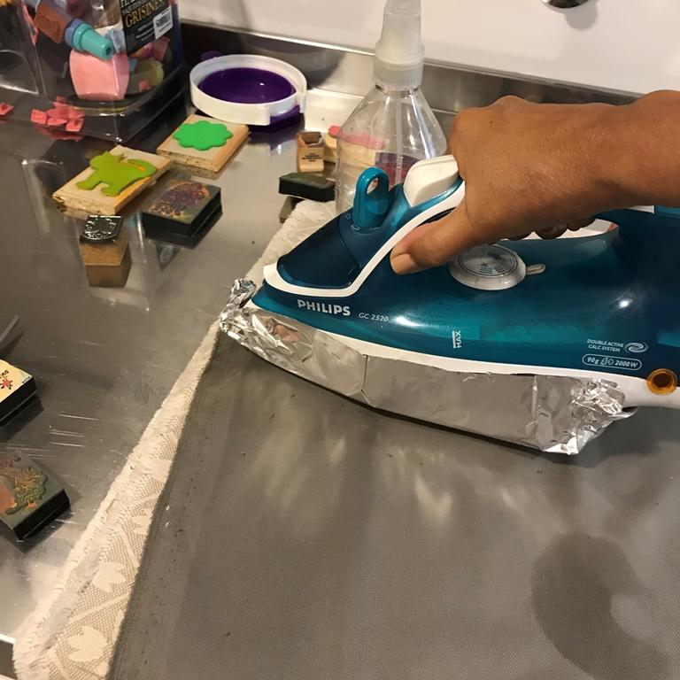 Humedecer con el agua del rociador el sello, y retirar el exceso de agua sacudiéndolo un poco, poner el sello con la figura hacia arriba; apoyar encima el terciopelo colocando el derecho de la tela sobre el sello, y por el revés de la tela rociar con agua la zona en que se hará la estampa. Apoyar la plancha sobre el sello, sin moverla por 20 segundos. Quitar.