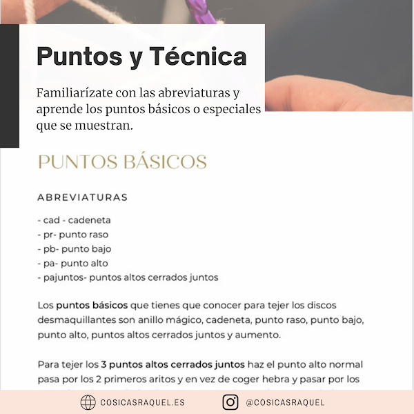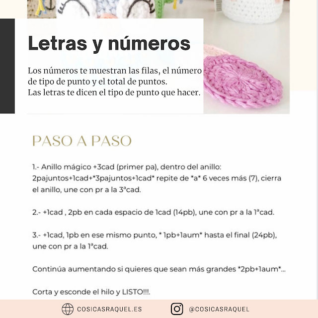 También vas a encontrar números que te indican el número de tipo de punto indicado con letras, por ejemplo 3cad o 2pb, tendrás que hacer 3 cadenetas o 2 puntos bajos, si no te pone el número se entiende que será 1 por ejemplo pr tienes que hacer un punto raso.
