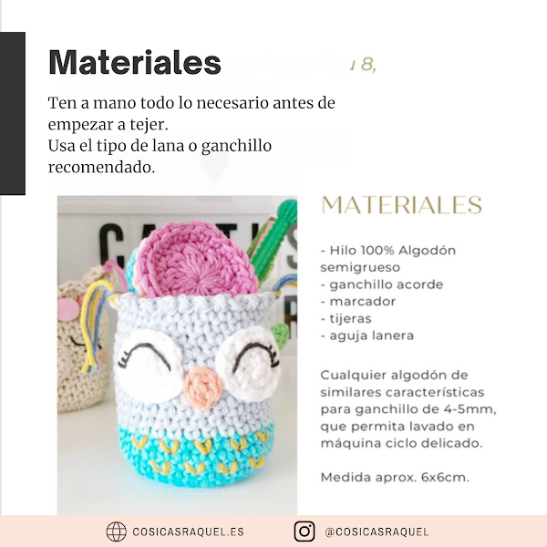 Es importante que te fijes en la lana y el número de ganchillo, siempre pongo el que yo uso pero puedes usar el hilo/lana que quieras siempre que escojas un ganchillo acorde, eso sí ten en cuenta que el tamaño de tu trabajo cambiará.