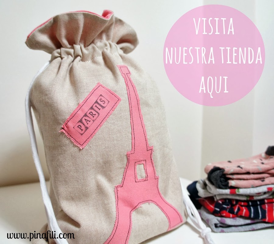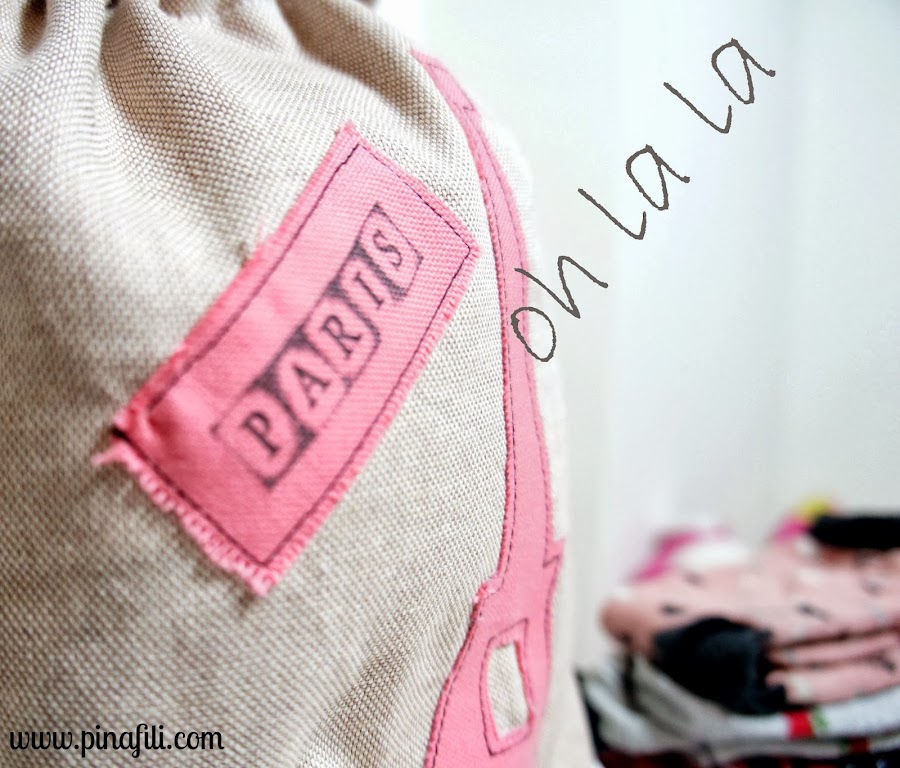 Y ya que nos ponemos a viajar, que mejor manera que decorarla con la Torre Eiffel. La silueta y un parche con el nombre de la ciudad, Paris, a juego con la tela del interior de la bolsa.