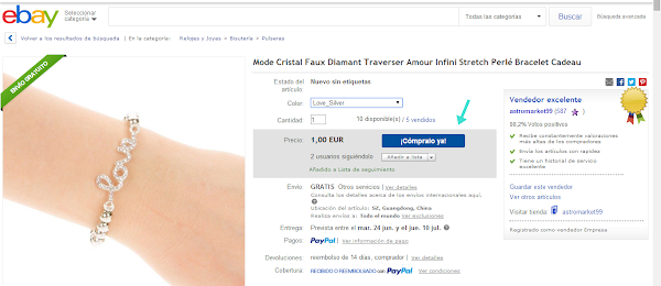 Y esto es todo. Yo nunca he tenido ningún problema, al contrario. Ha habido veces que el artículo cambiaba un poco respecto a la fotografía o la descripción o que no ha llegado y con sólo ponerme en contacto con el vendedor (un mensaje y en español) me han devuelto el dinero sin más o me han enviado otro artículo.