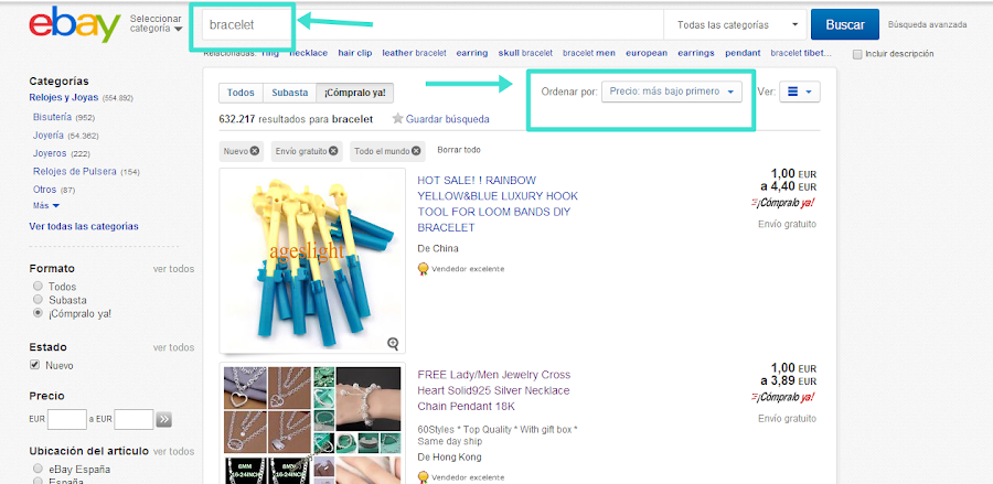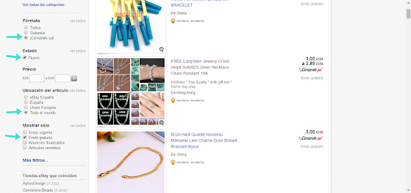 Ahora, en la columna izquierda, señalamos estos filtros: ¡Cómpralo ya! (para que no sea por subasta); Nuevo; Todo el mundo; Envío gratuito