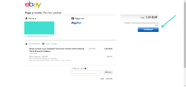 Ahora te saldrán una serie de ventanas con el proceso de pago. Es muy intuitivo, siempre hay que leer el botón azul y clickar en él. En estas ventanas es donde aparece la dirección de envío. Puedes tener varias y seleccionar según el artículo.