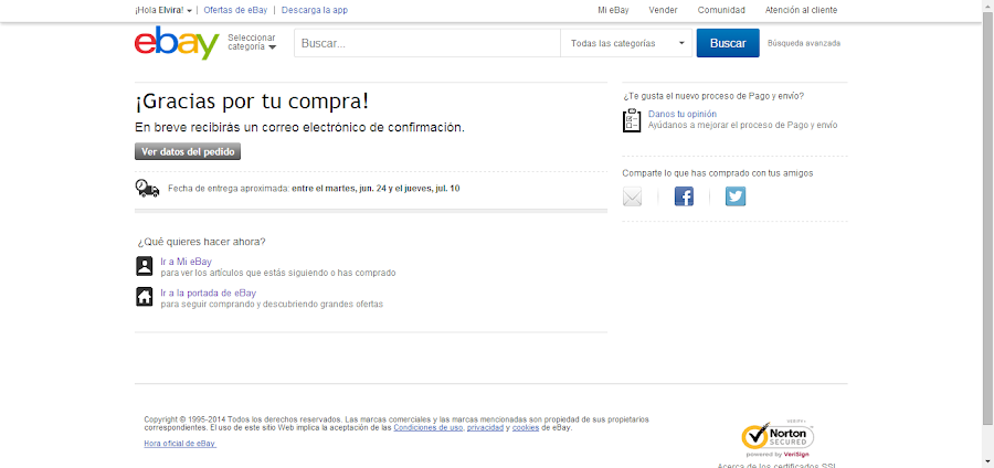 Y una vez realizado todo el procedimiento, ebay te agradece tu compra y te informa de cuándo (aproximadamente) tendrás el pedido en casa. Con los envíos desde China o Japón no desesperéis. Es normal que tarden unas tres semanas en llegar. Si tardan más de un mes, enviad un mensaje al vendedor que se pondrá en contacto con vosotros y os solucionará el problema.
