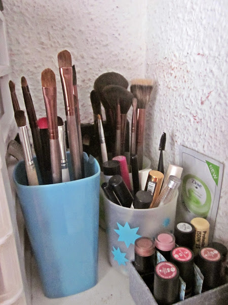 Por último, en dos de los tres cubiletes tengo las brochas de maquillaje: uno para las de ojos y otro para las de rostro. Todas están guardadas con la técnica que os expliqué en esta entrada.