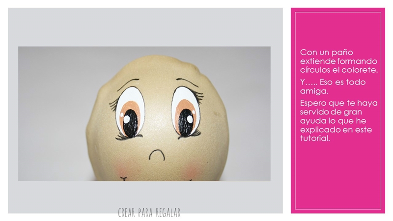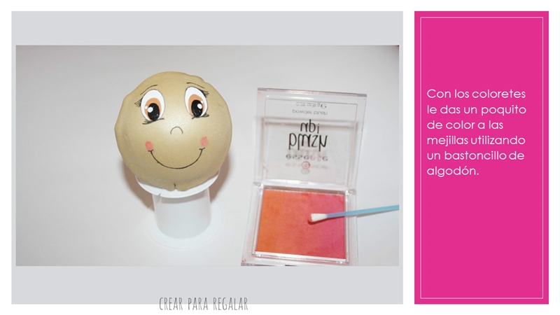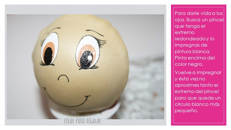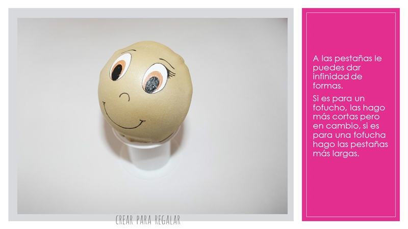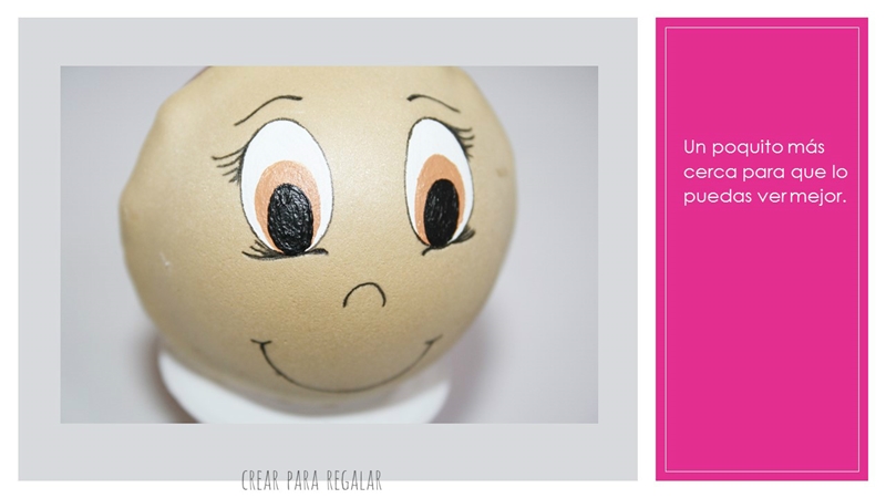 Lo más complicado puede ser pintar los ojos pero con la práctica todo va mejorando. Si navegas por google y ves todas las imágenes de fofuchas, podrás comprobar que cada cual tiene su forma de pintarle los ojos.