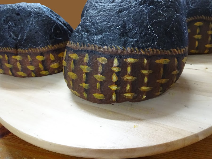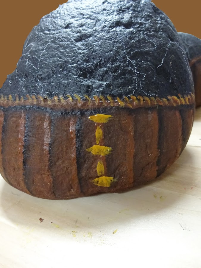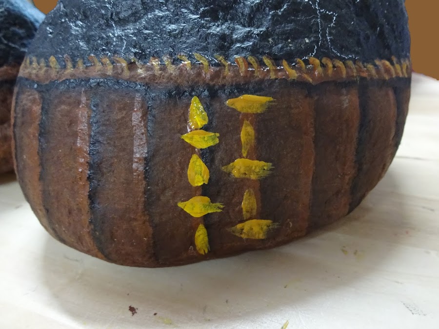 Con el mismo color marrón teja pintaremos unas líneas verticales a lo largo de todo el cesto, como se ve en la imagen, tanto por delante como por detrás de la piedra.