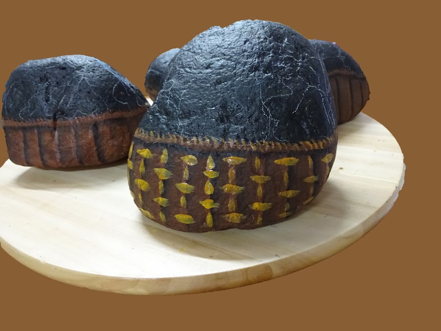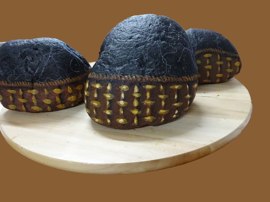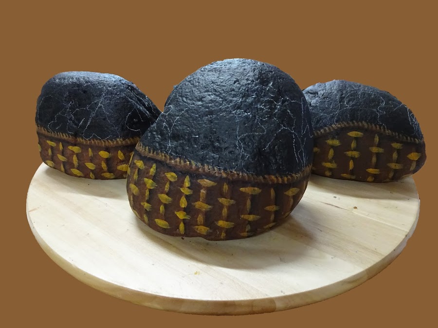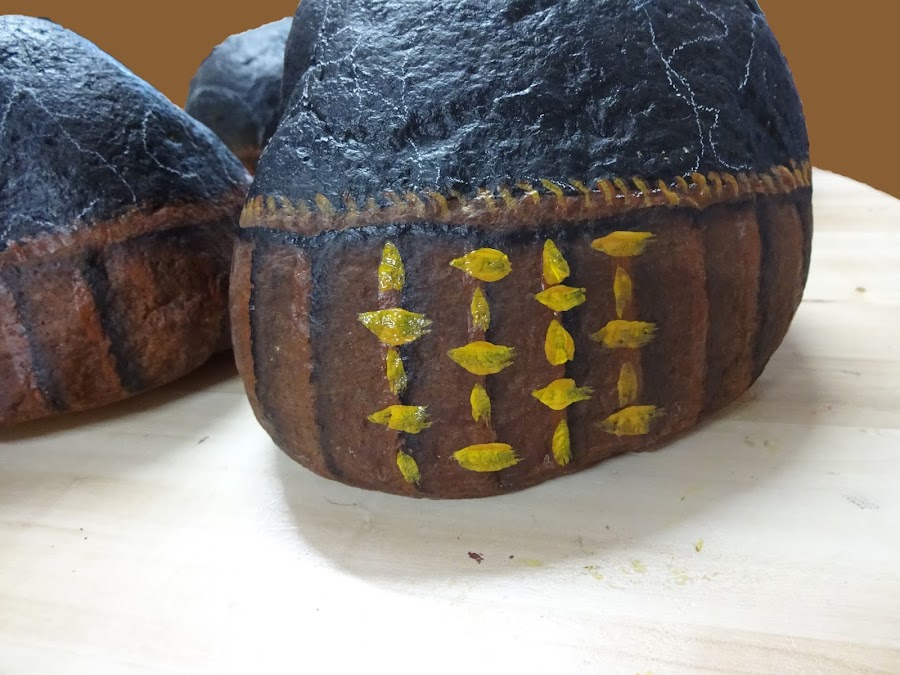 Para terminar las cestas pinté un asa con el mismo procedimiento: pintar una línea en color negro, con color marrón teja pintar líneas diagonales, añadir color amarillo y aplicar a todas las líneas diagonales y por último dar un toque de luz con color blanco.