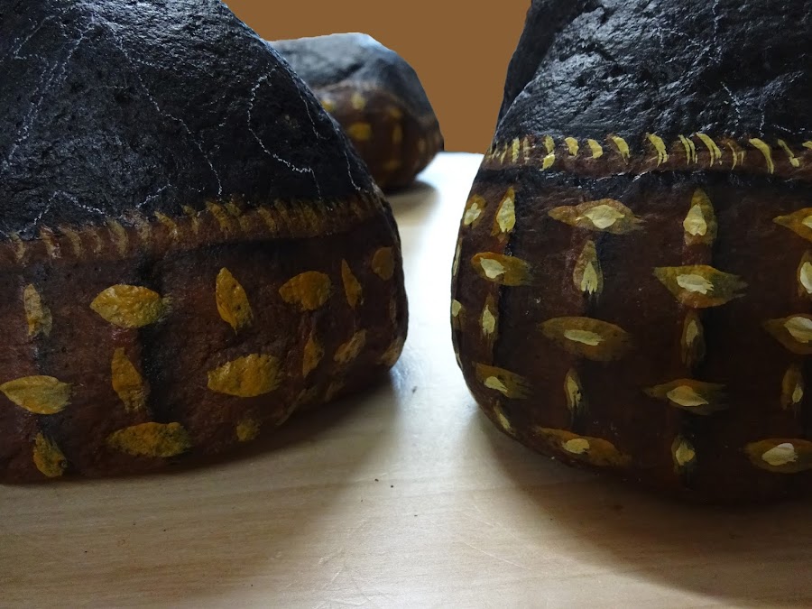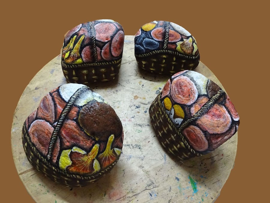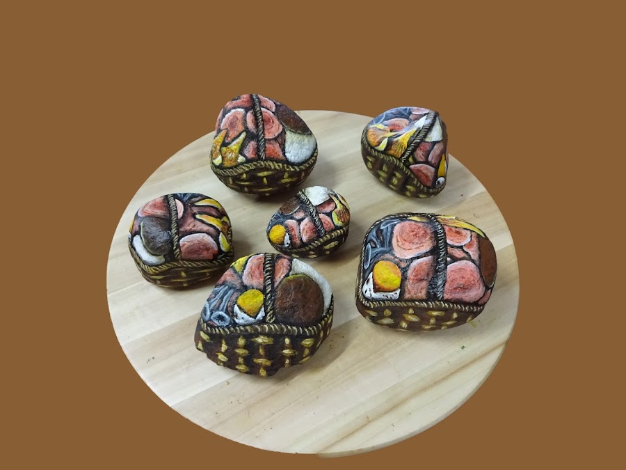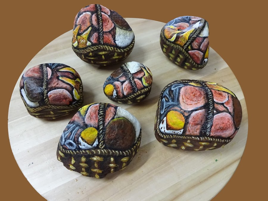 Aquí todas las piedras pintadas con el mismo dibujo.