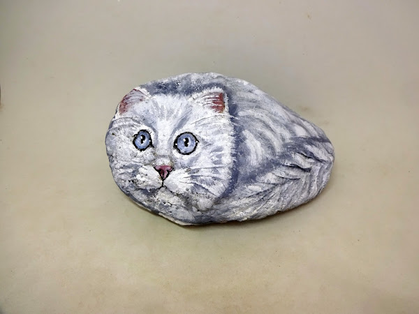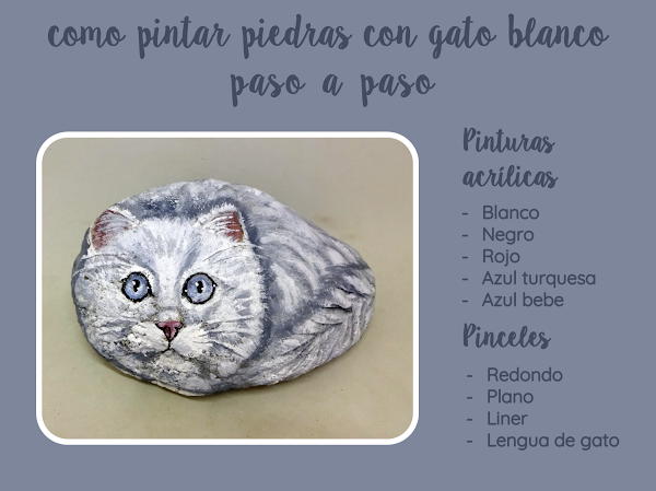 Por lo tanto, a la hora de pintar piedras con gato blanco, empezaremos pintando una base en color gris medio claro, alrededor de la cabeza y de la cola pintaremos con color gris más fuerte para dejar ver que es la sombra que proyecta la cabeza sobre el cuerpo y así poco a poco iré poniendo luces y sombras en la cara y en el cuerpo simulando el pelaje, hasta llegar a los bigotes del gato que es lo último que pinto