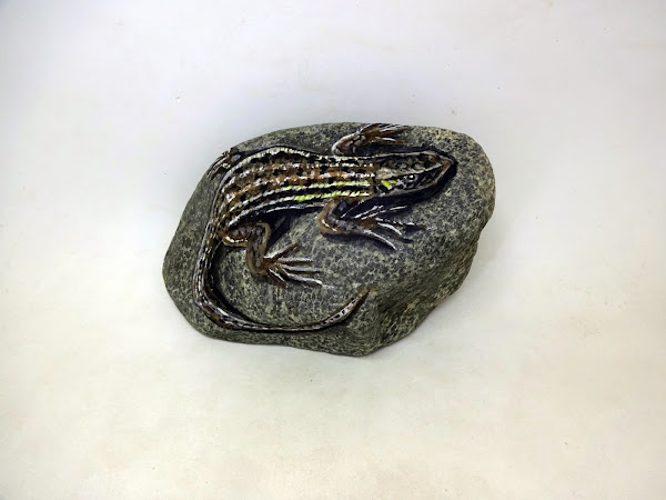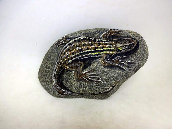 La pintura de esta piedra la he realizado mucho más grande de lo que es en realidad ya que si hubiera hecho el vídeo con una lagartija a tamaño real no podrías apreciar los detalles que menciono en el mismo, así que no te asustes si ves que el animalito es demasiado grande para parecer verdadero