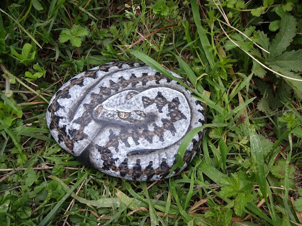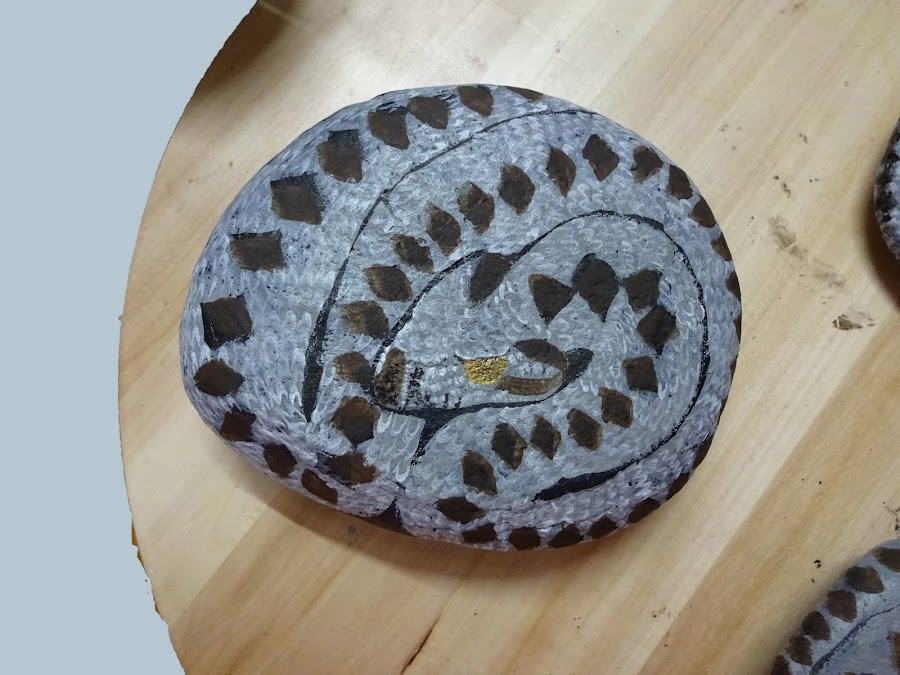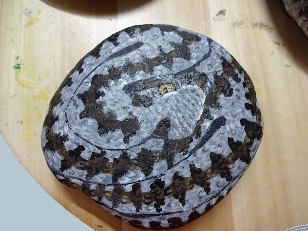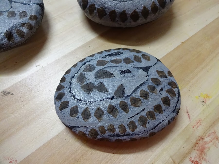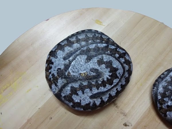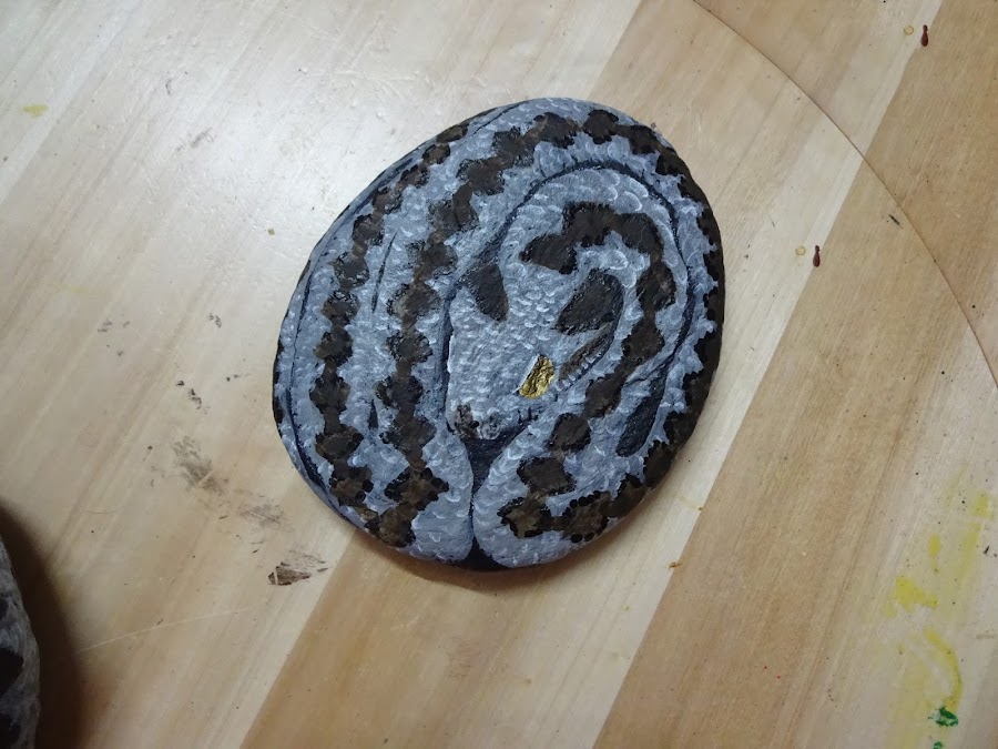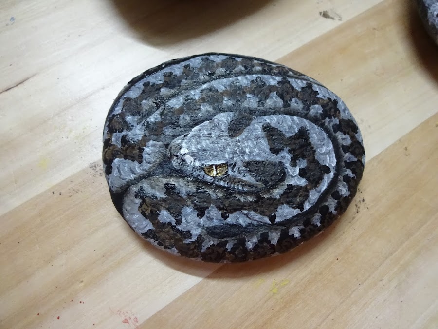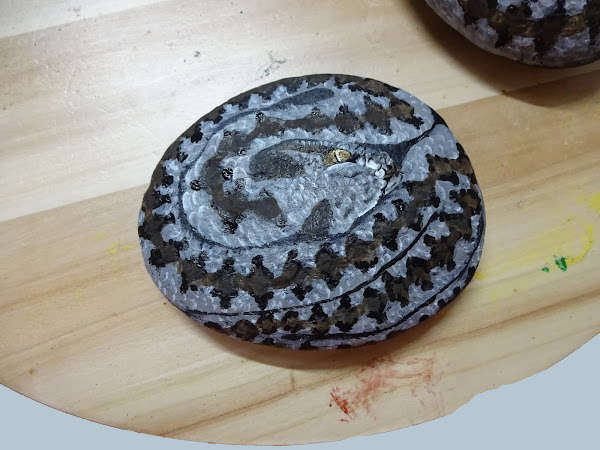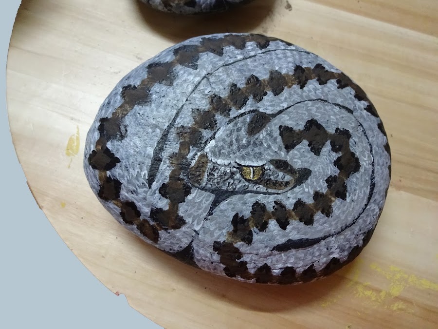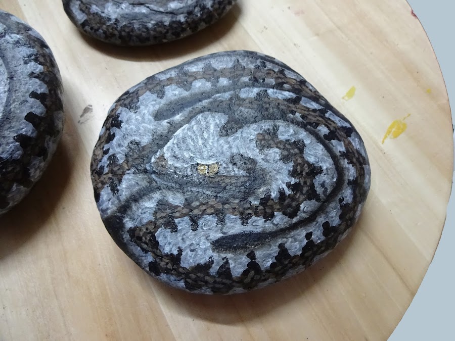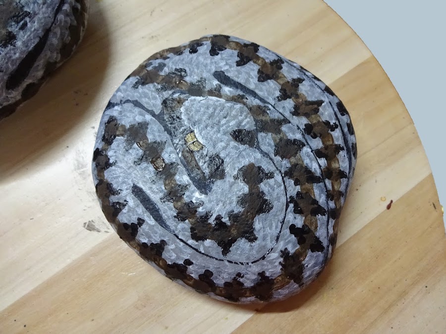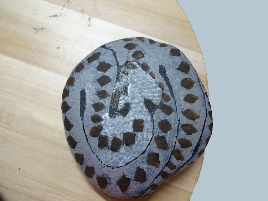Pintamos la piedra de color gris ceniza procurando dejar las líneas para ver por dónde va la serpiente y también los rombos típicos de este tipo de víboras.