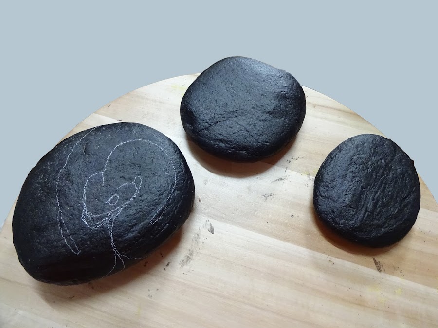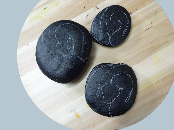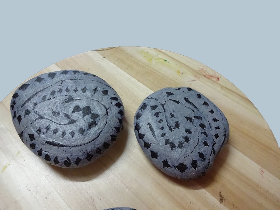 Pintamos toda la piedra con negro. Y realizamos el dibujo correspondiente encima de la piedra.