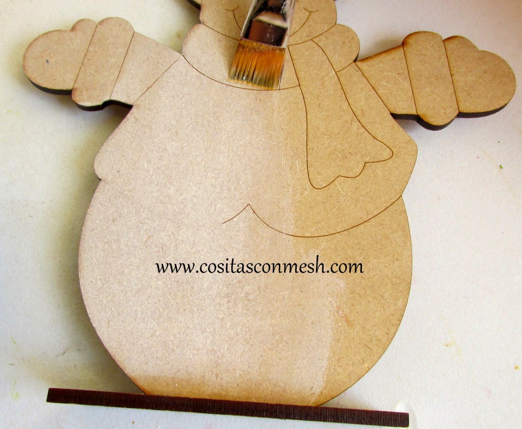 1.-Hacemos una aguada con la pintura blanca (eso quiere decir que vamos a diluir la pintura con un poco de agua,buscamos pintar toda nuestra pieza con un blanco casi transparente ,eso es una aguada el cual es una base antes de comenzar a pintar a nuestro muñeco de nieve ).