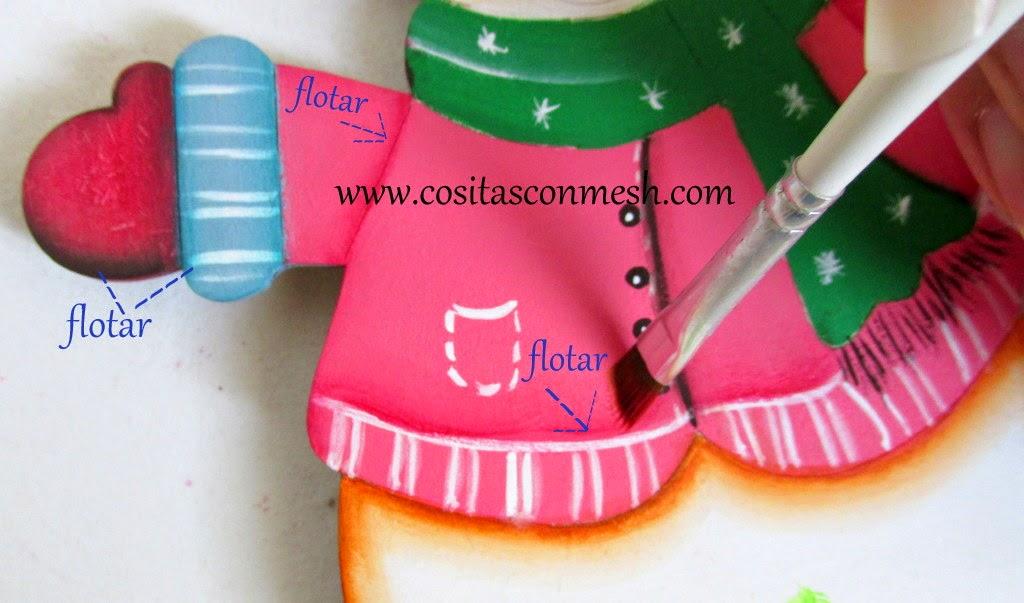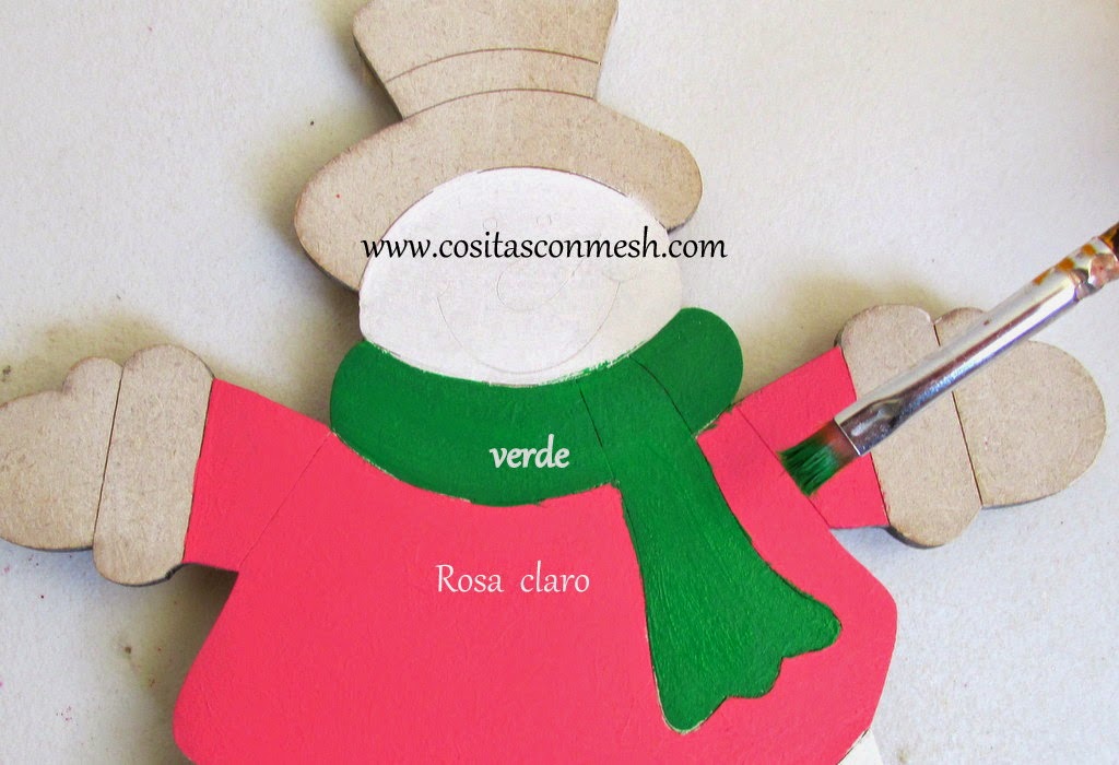 3.-Pintare la chaqueta de rosa claro,la bufanda de verde,puedes usar otro pincel para pintar estas piezas mas pequeñas.