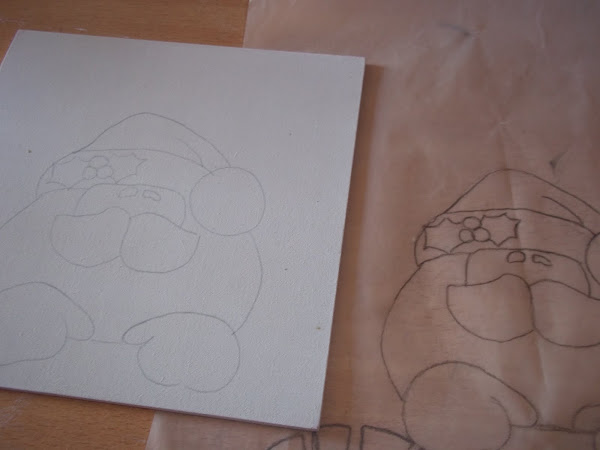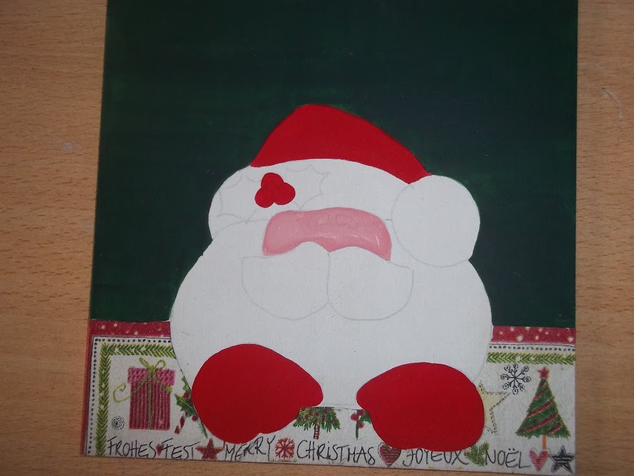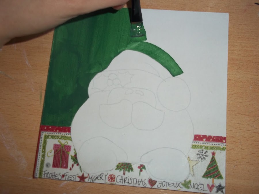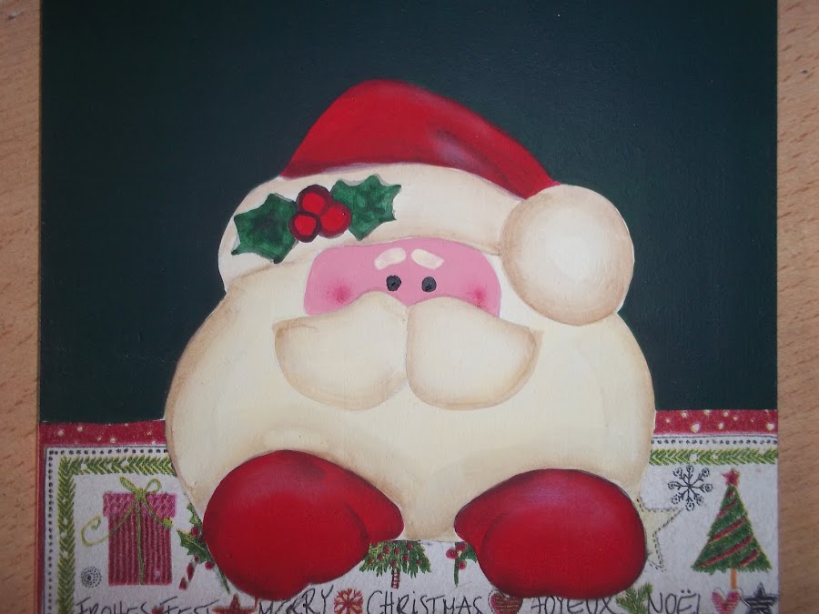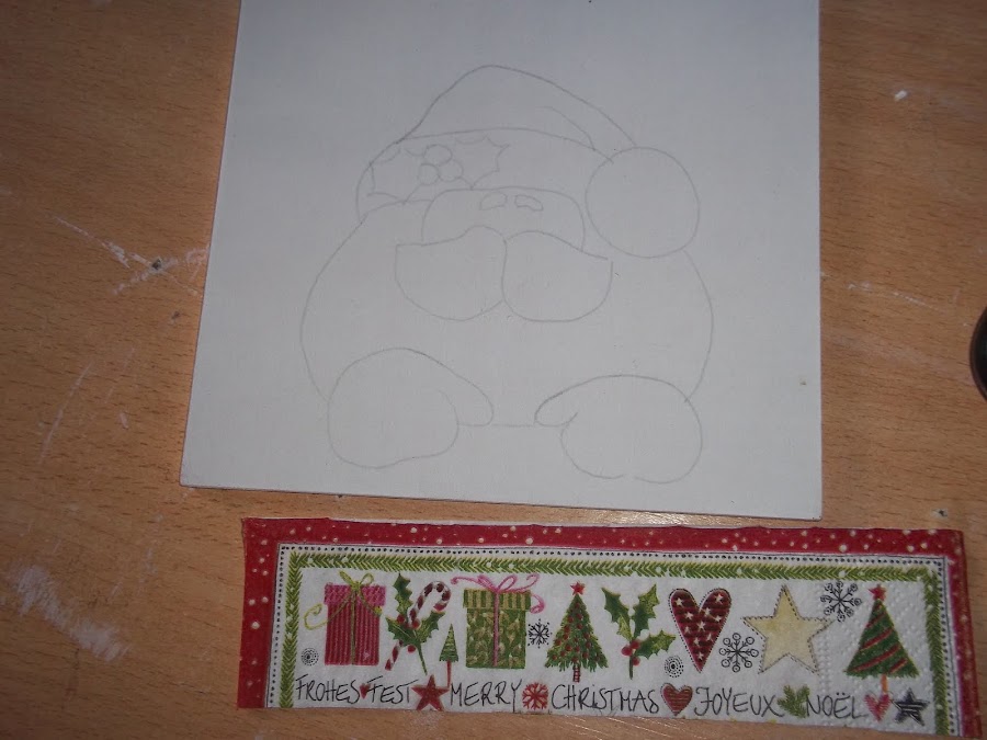 Recortamos la servilleta a utilizar,yo en este caso use una con motivo navideño,pero queda a criterio de cada uno, sacamos las dos capas de papel de la servilleta y procedemos a realizar la técnica pegando la servilleta de tal manera que concuerde con las manos de Papá Noel.
