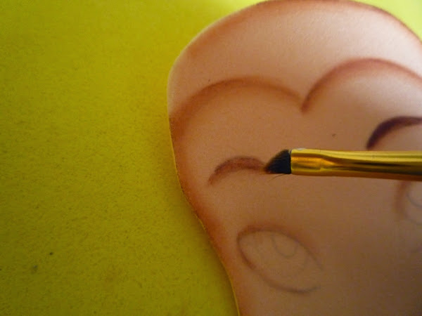 2.- Ahora con la punta del pincel tomamos una pizca de pintura acrílica de un color mas fuerte al color de foamy que estemos usando, en mi caso uso un café para el contorno de la cara y para hacer las sombras del cabello.