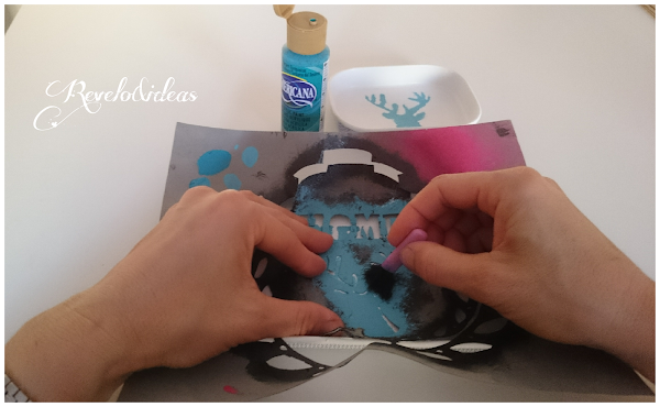 Con una plantilla haremos el estarcido del dibujo, con una pintura acrílica al agua color azul turquesa, con un pincel o también se puede hacer con una esponja.