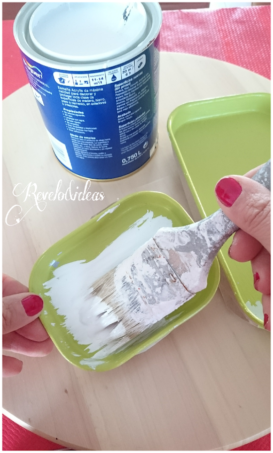 En primer lugar pintaremos con una brocha o rodillo como prefiramos, para renovar las bandejas, daremos una mano de pintura acrílica blanca, no necesitará imprimación previa, ya que son pintadas por segunda vez, pero si son bandejas nuevas daremos una imprimación todo terreno, para asegurarnos de una buena adherencia de la pintura.
