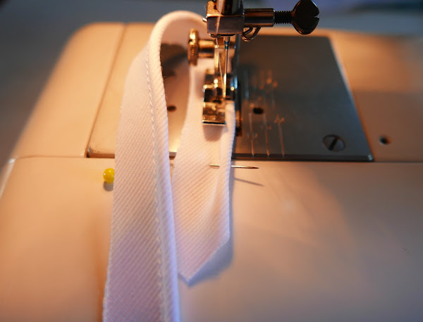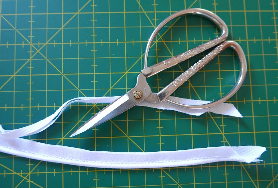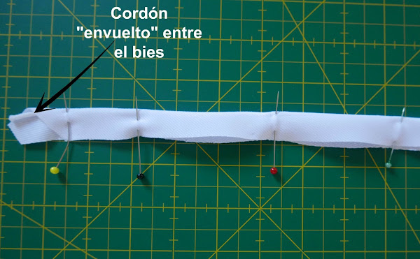 Después colocaremos en la zona media el cordón y doblaremos el bies, dejando en el interior el cordón de algodón.