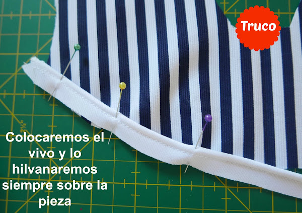Aunque normalmente trabajemos solamente con los alfileres, os recomiendo que en el caso de colocar un vivo, hilvanemos la costura.
