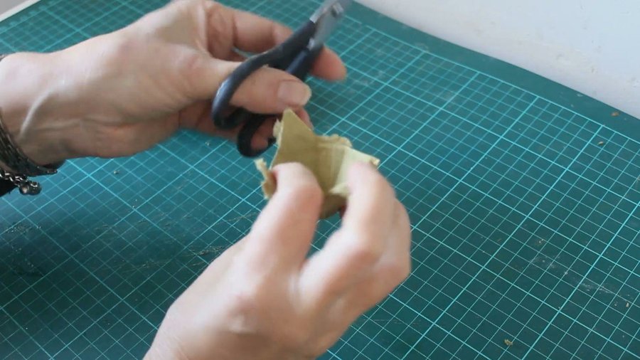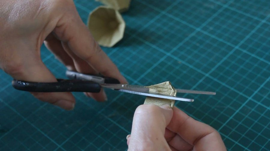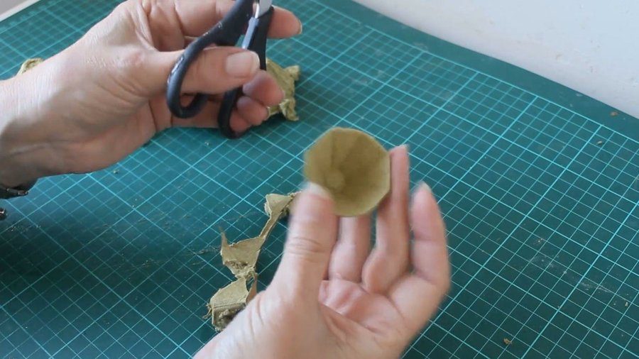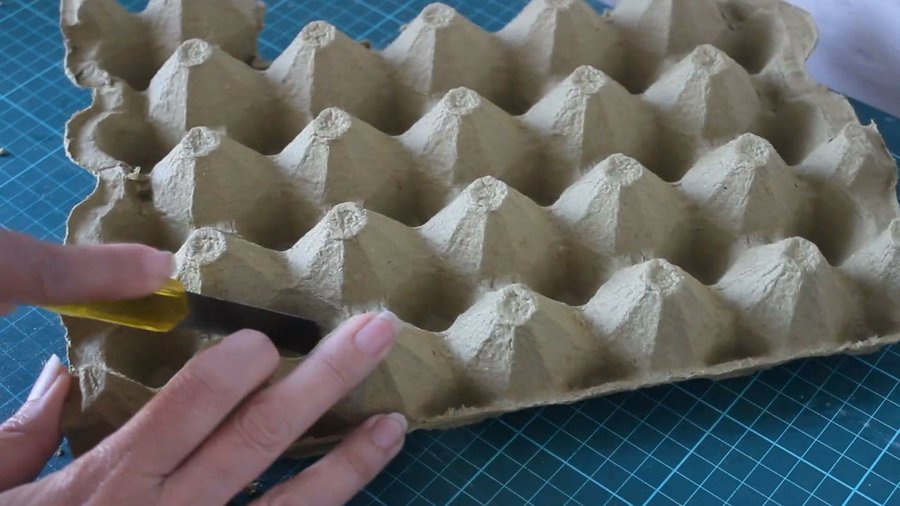 El primer paso consiste en recortar cada una de las celdas o canastitas del cartón pero debido a su estructura me fué bastante difícil al comienzo, por eso intenté con diferentes elementos: una tijera, un cuchillo dentado, diferentes tipos de cuchillas o cúters pero finalmente pude comprobar que la mejor opción era utilizar un cúter de cuchilla larga y bien afilada. Para hacer los cortes tenemos que poner el cartón boca abajo...