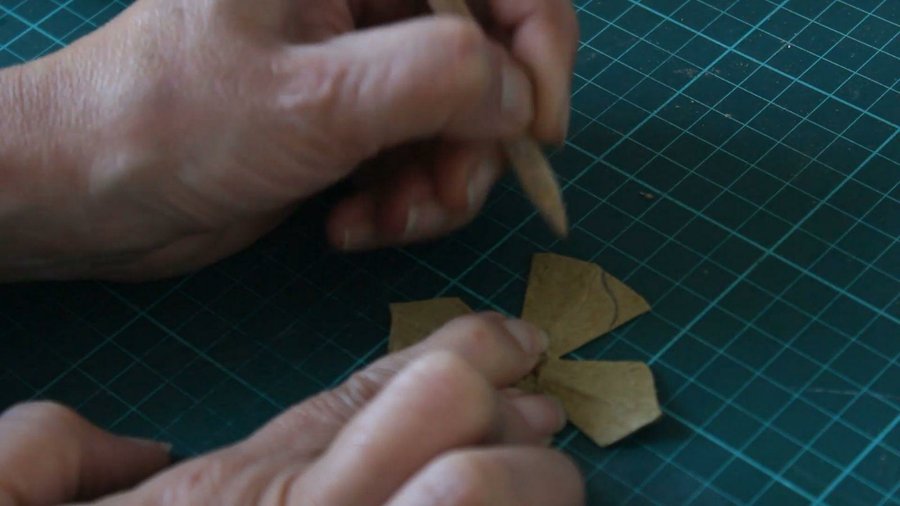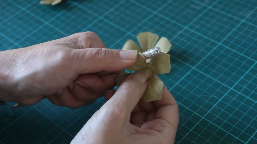 Para darle un poco de movimiento a nuestra flor vamos a tomar un lápiz o el cabo de un pincel también podría ser, para curvar cada pétalo hacia afuera...