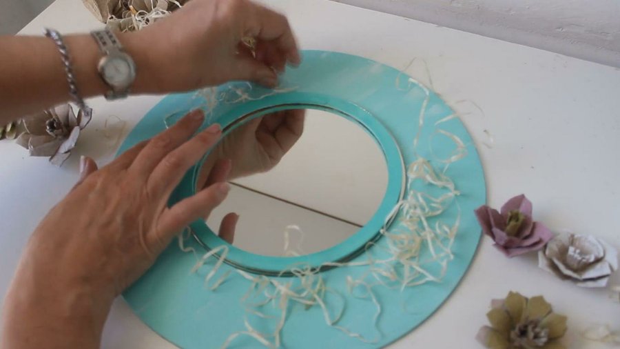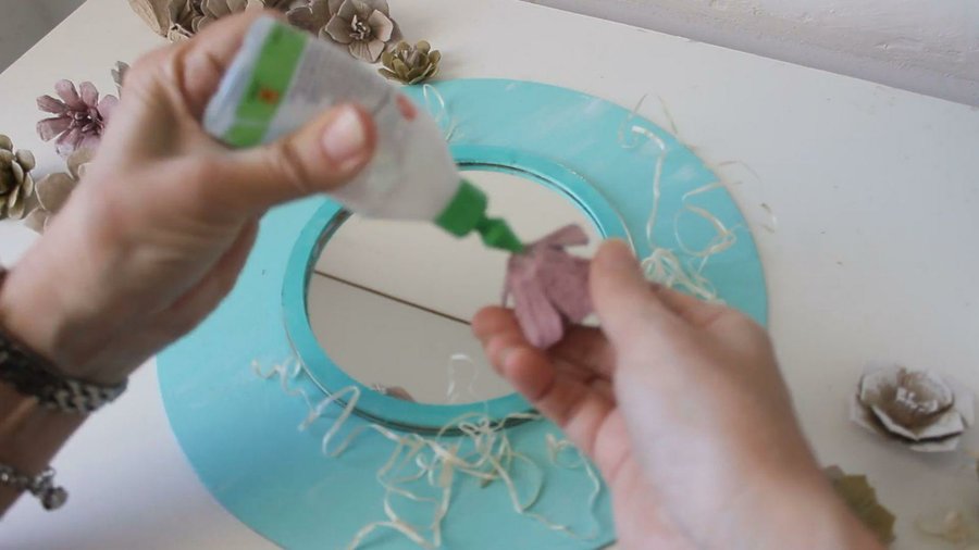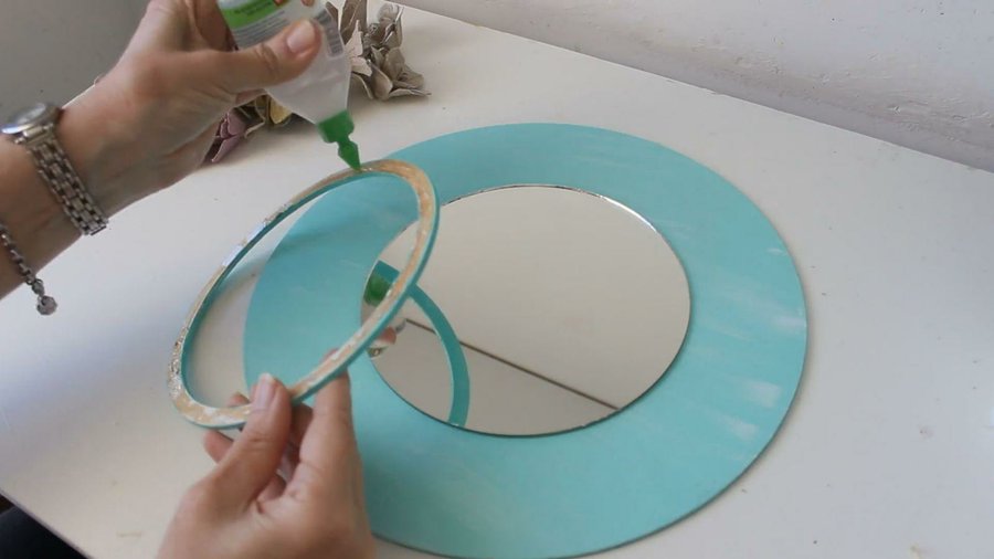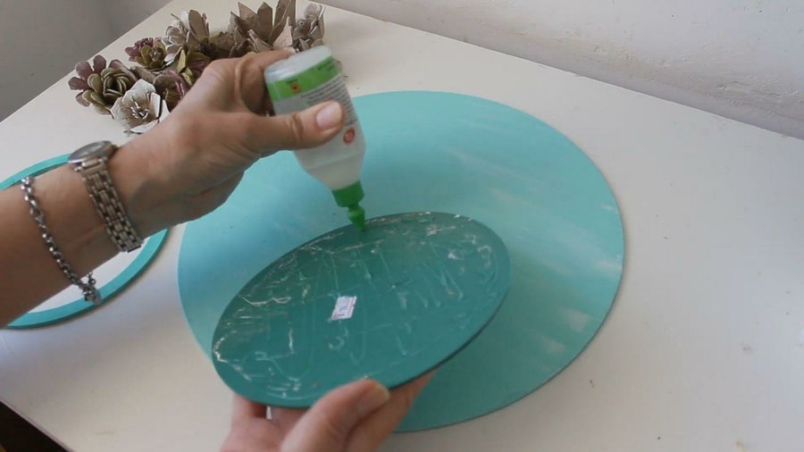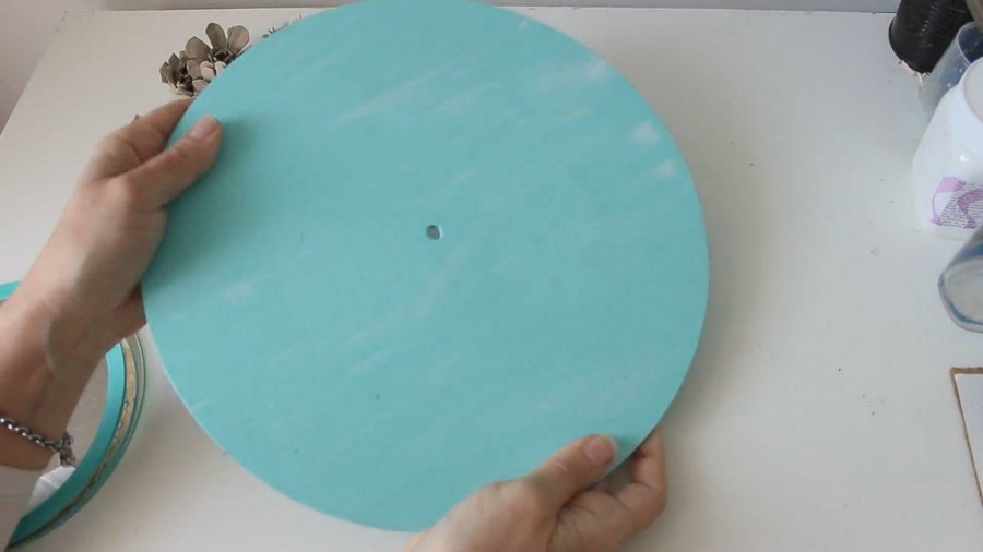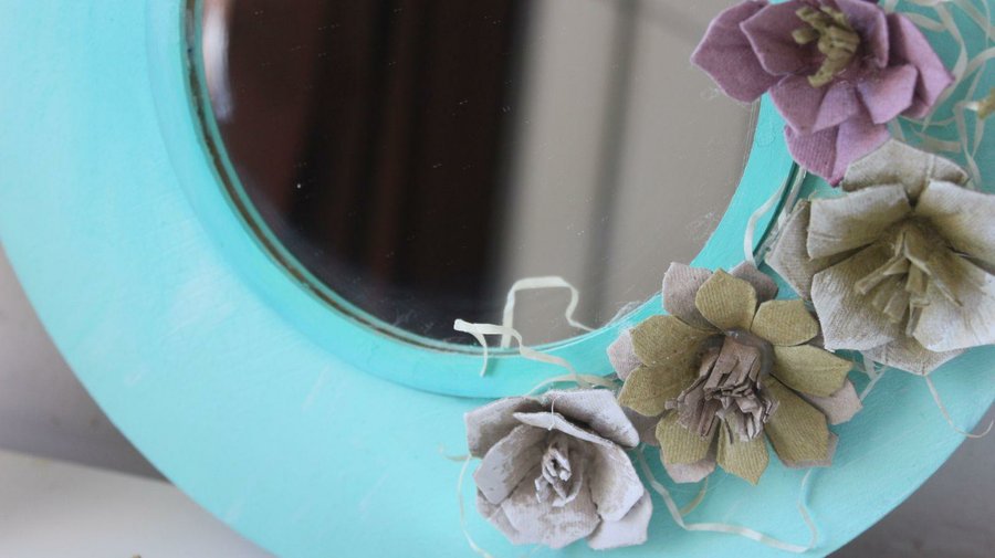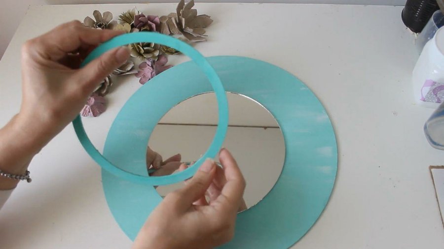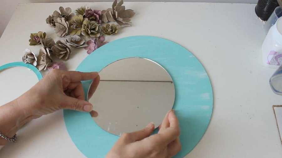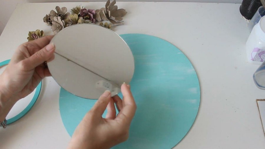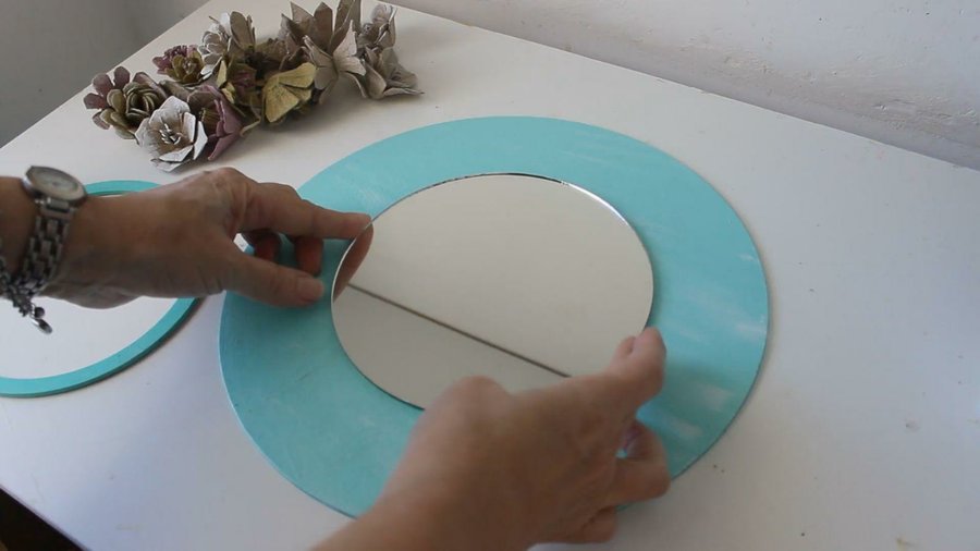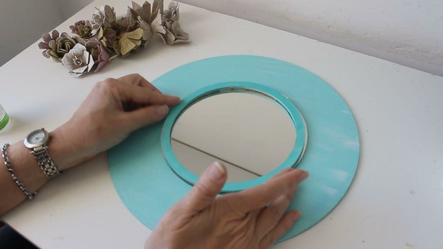 Para armar el espejo vamos a necesitar un círculo de fibrofácil o mdf (también podría ser de un cartón firme) y lo vamos a pintar del color de nuestra preferencia, en este caso yo elegí pintura turquesa para que las flores se destaquen más y le dí apenas unas pinceladas de pintura acrílica blanca con pincel seco...