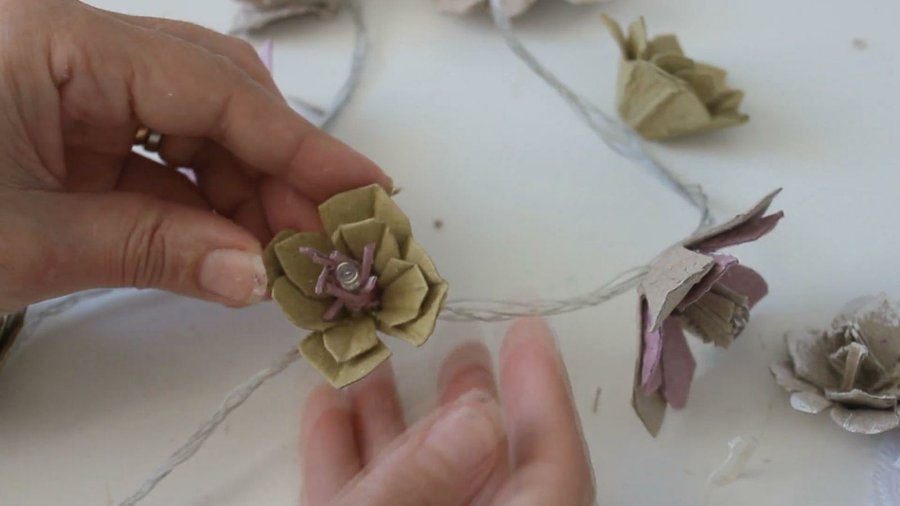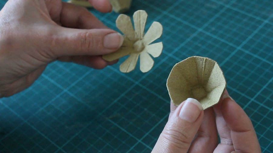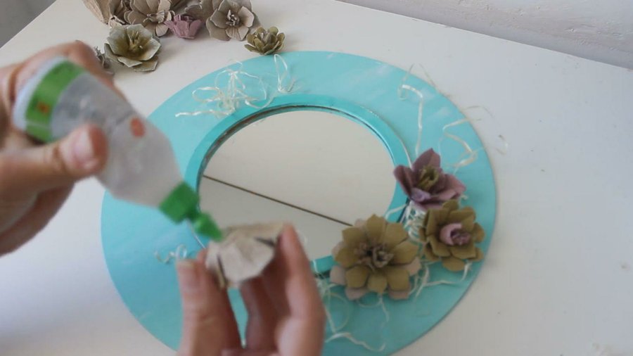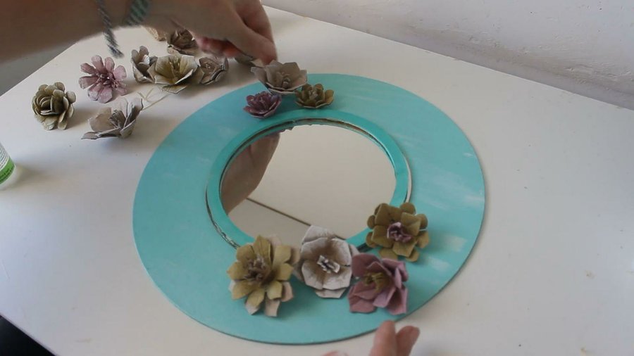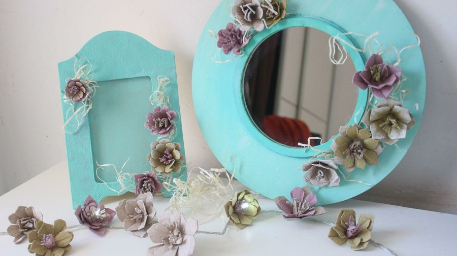 Por eso hoy les comparto cómo reciclé cartones de huevos o también conocidos como maples o hueveras para convertirlos en elegantes y alegres flores que apliqué en tres trabajos diferentes: un espejo, un marco de fotos y unas luces en serie.