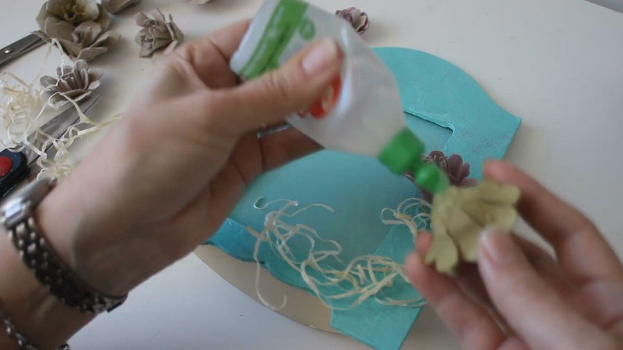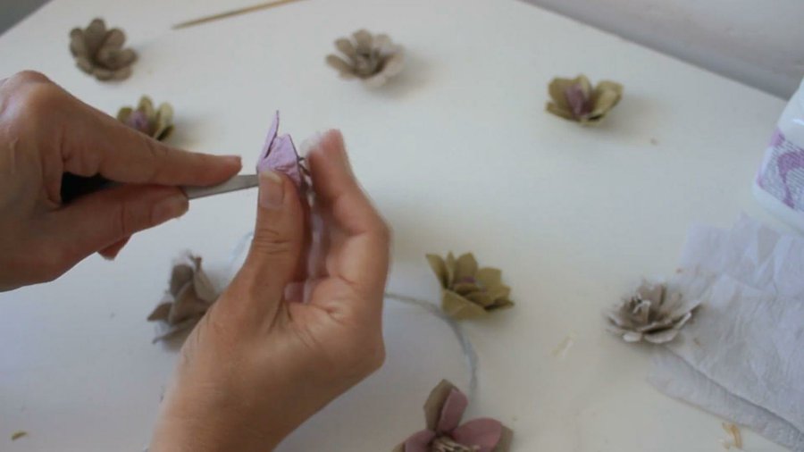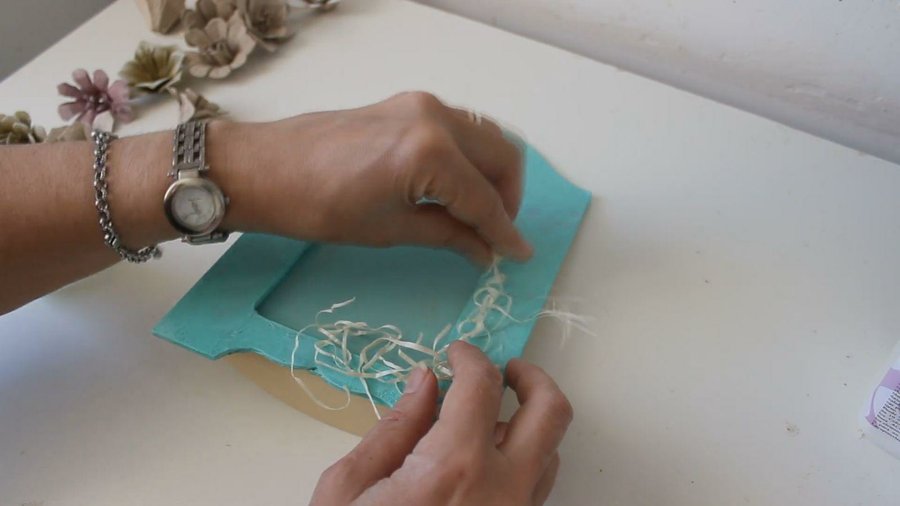 Para completar y rellenar los espacios antes de pegar las flores le pegué biruta de las que suelen venir en los cajones de algunas frutas y que también se consiguen en las verdulerías...