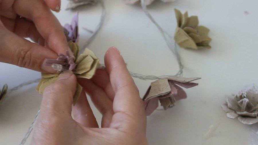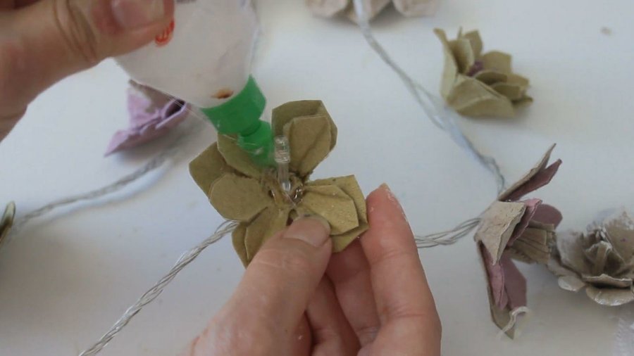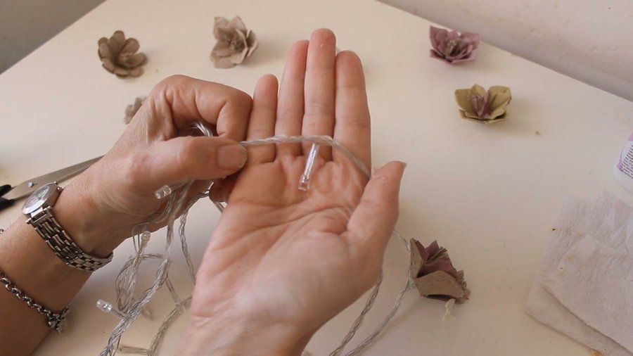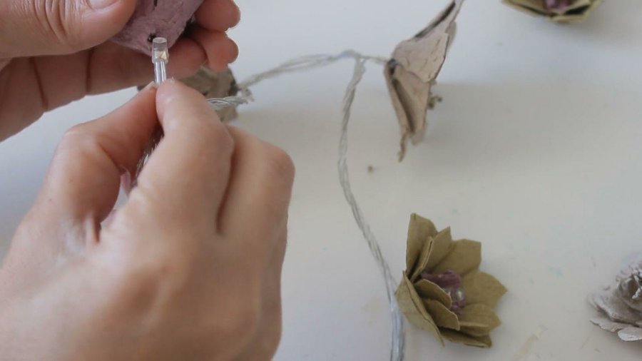 Si les resultara muy costoso colocarlas con los pistilos de la flor ya pegados los podemos retirar para pegarlos una vez que ya hayamos introducido la lamparita...