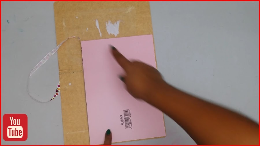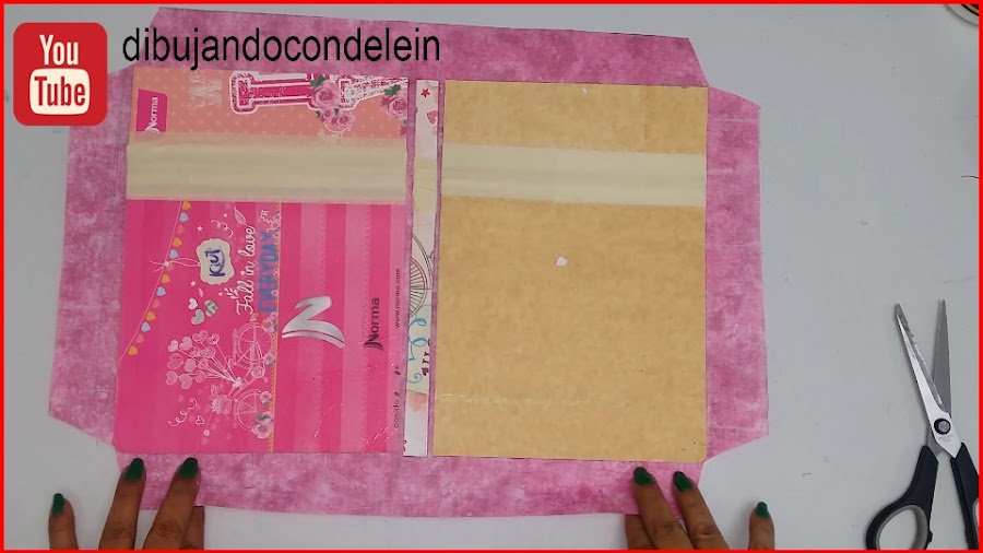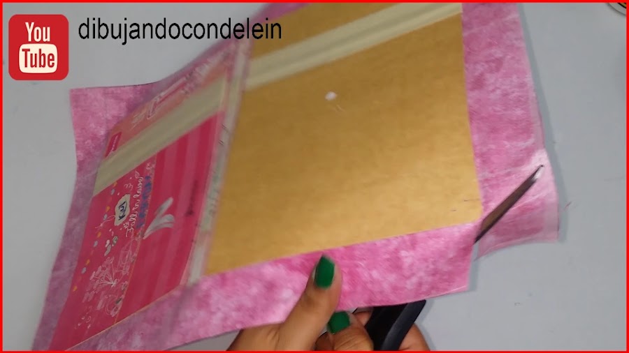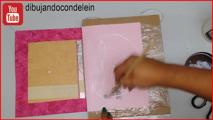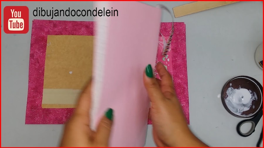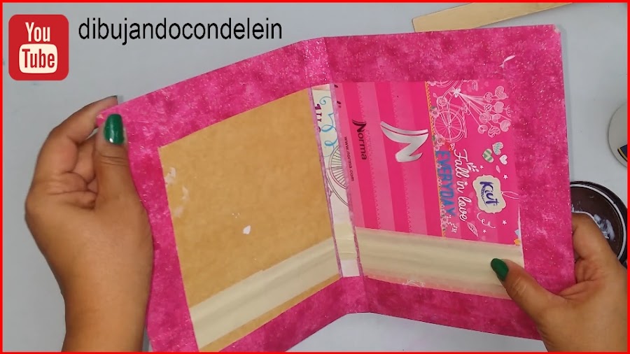 Una vez ya hayamos colocado el pegamento le vamos a colocar la parte interna de nuestra libreta, tal y como se muestra en la imagen, ahora voy a tomar una pieza de carton forrada en plástico que siempre tengo a la mano.