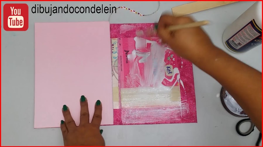 Esta pieza la vamos a colocar de manera tal que cuando estemos colocando la pega en el lado siguiente, nos aseguremos que las hojas de la libreta como tal no se van a llenar de pega, luego procedemos a colocar pegamento tal y como lo muestran las imágenes.
