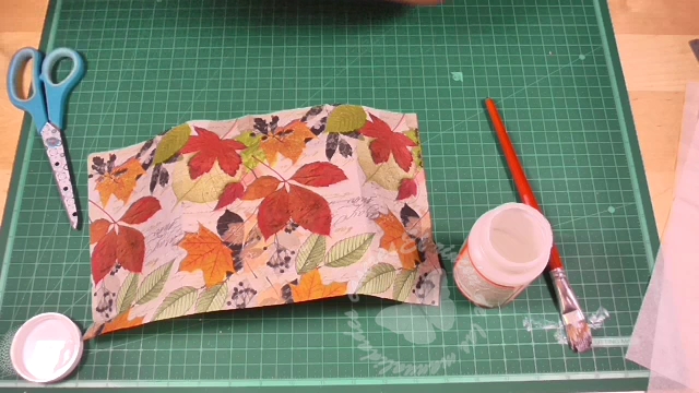 El siguiente paso será hacerle el decoupage, yo he escogido un motivo de servilleta muy otoñal, ya que nos queda poco del verano y comenzamos el Otoño. Comenzaremos recortando el trozo de servilleta que vayamos a utilizar y lo pegaremos al corcho con cola blanca, adhesivo para decoupage o como en mi caso el adhesivo Mod Podge, con esta misma técnica he decorado también el portacartas y después de pegar la servilleta le daremos una capa por encima del mismo adhesivo para protegerla y lo dejaremos secar.