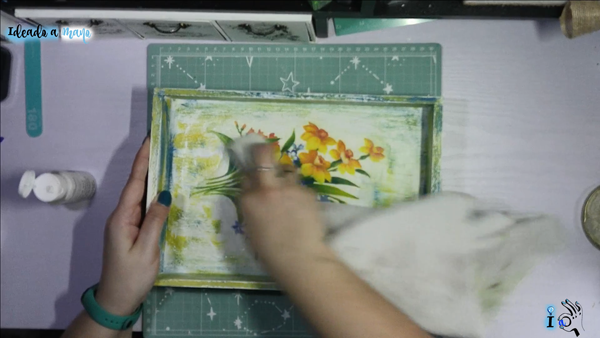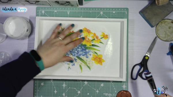 Cuando se ha secado es el momento del decoupage. Como os digo utilizo un papel de arroz de narcisos y lilas que me encanta, y recorto rasgando a mano alrededor del motivo. Luego realizo el decoupage como siempre, solo que al ser papel de arroz no necesito poner un plástico por encima para extender el papel.