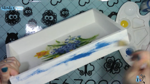 Cuando el decoupage ha secado preparo la caja para el decapado. Para ello primero froto una vela por la superficie de la caja, por las zonas por dónde luego quiero que salte la pintura, porque así no se adhiere tanto y salta más facilmente al lijar. Luego cojo un pincel de cerdas largas y duras y, con poca pintura, doy brochazos con pintura azul.