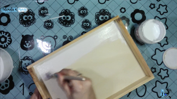 Luego doy una imprimación de gesso, para cerrar el poro de la madera y que no absorva tanta pintura después, ya que luego voy a pintarla con pintura blanca.