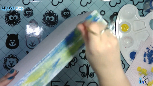 Luego doy brochazos por encima con pintura amarilla (amarillo cadmio, que es parecida a la de los narcisos) con el mismo pincel pero sin que se vuelva verde al juntar el amarillo y el azul.