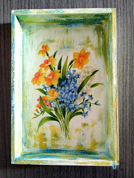 Hoy os muestro cómo usar una caja de dulces navideños para hacer una bandeja decorada con decoupage y con un decapado tricolor muy especial. Tenía un papel de arroz con narcisos y lilas que tenía muchas ganas de utilizar y creo que en esta bandeja ha quedado ideal, qué os parece?