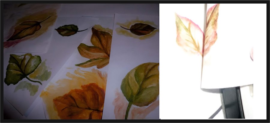 Diseño- dibujamos algún motivo como flores, hojas, letras o simplemente manchas, no es necesario saber dibujar, podemos buscar en la web (en este caso pinte hojas ) yo encontré algunas hojas en mi jardín y las use de molde, un secreto, para esfumar la pintura yo uso alcohol en lugar de agua y no se preocupen si el papel se pone amarillo.