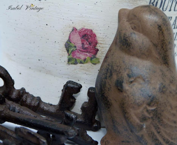 Decoración con transfer y decoupage de rosas y envejecido con pátina de ceras oscura y blanca y salpicado de pintura