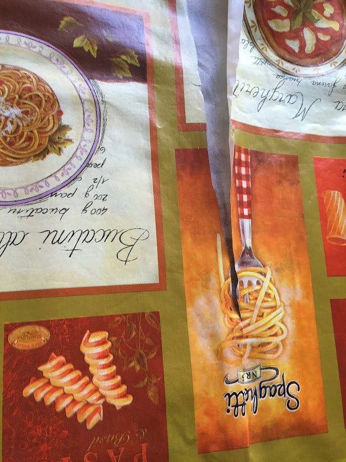 A la vez el hule que pongo debajo del mantel (nunca entenderé por qué los compro estampados en lugar de blancos, si al final lo que hago es poner un mantel de tela encima) estaba rajado en las lineas de los dobleces. Para tirar.