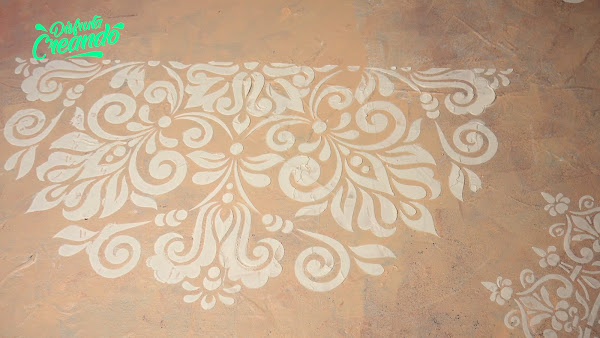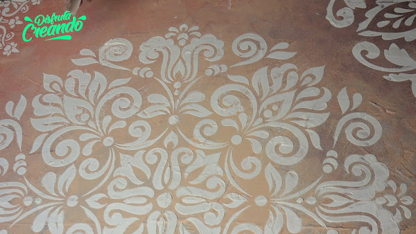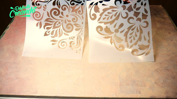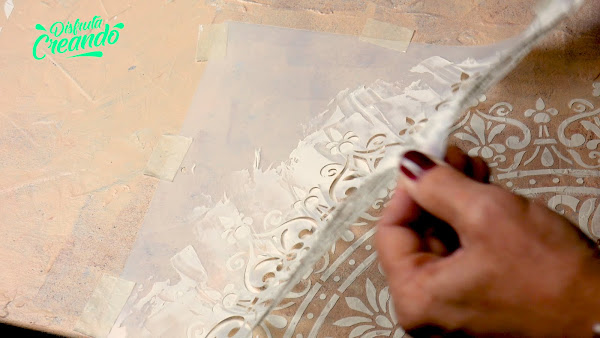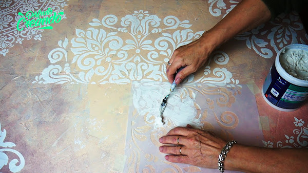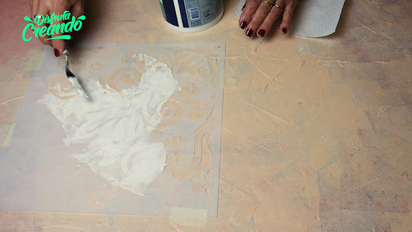 Ya se secó el del medio, ubico el stencil limpio para hacer la otra parte haciendo coincidir los dibujos, sujeto y vuelvo a aplicar la pasta terminando así de hacer medio mandala que de nuevo retiro el stencil y lo dejo secar.