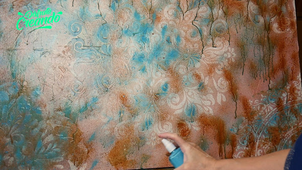 Se van matizando los colores turquesa, cobre, marrones y el cuadro va tomando aspecto de envejecido.