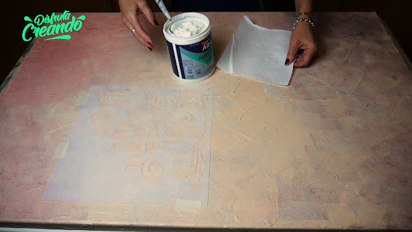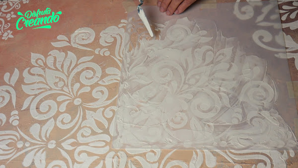 Empleando una espátula se distribuye en forma homogénea por todo el stencil, en el grosor que le quieran dar y van sacando el exceso.