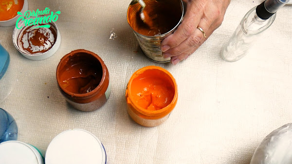 Ahora voy a mezclar siena calcinada con amarillo oro, lo mezclo en un recipiente y voy agregando agua y mezclando, tiene que estar bastante líquido para que pase por el spray, cuando lo tengo lo coloco dentro del envase y agito.