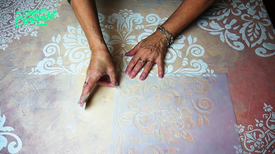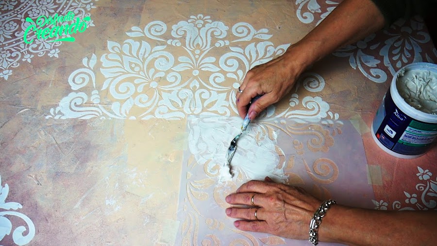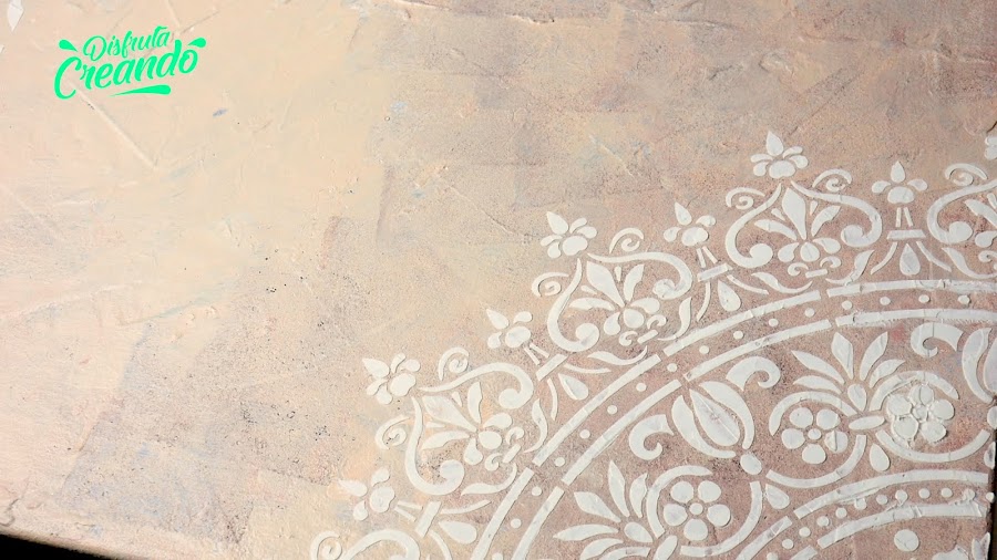 Ya se secó el del medio, ubico el stencil limpio para hacer la otra parte haciendo coincidir los dibujos, sujeto y vuelvo a aplicar la pasta terminando así de hacer medio mandala que de nuevo retiro el stencil y lo dejo secar.